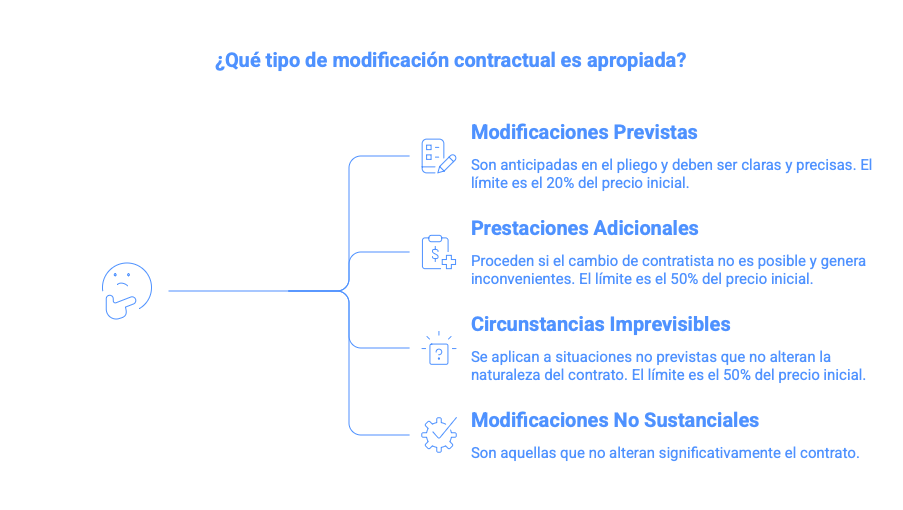 1. Prestaciones Adicionales (Art. 205.2.a): Cuando el cambio de contratista no es posible por razones técnicas o económicas y generaría inconvenientes significativos. El límite es el 50% del precio inicial.