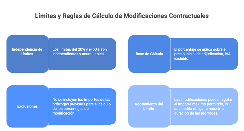 - Reducción de prórrogas: Las modificaciones pueden agotar el importe máximo permitido, lo que podría obligar a reducir la duración de las prórrogas o impedir que estas lleguen a celebrarse si el límite económico ya se ha alcanzado.